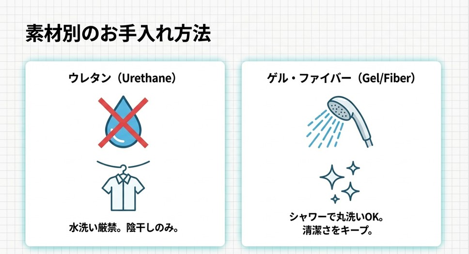 - ゲル・TPE・ファイバー素材: これらは水洗いが可能な場合がほとんどです。シャワーで丸洗いできるので、汗をかきやすい夏場でも清潔に保つことができます。ただし、直射日光は劣化の原因になるため、必ず陰干しで乾かしてください。