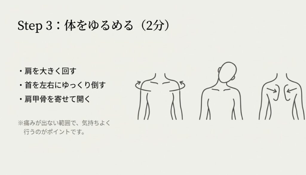 ③ 肩・首をゆるめる簡単ストレッチ(2分)
